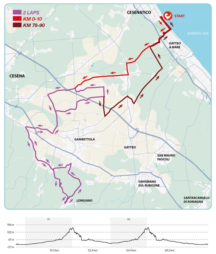 The bike course will include a flat section at the start and finish followed by a panoramic and hilly central part, crossing through the regions of Cesena , Montiano, Roncofreddo, Longiano, Gambettola and Gatteo; it will be a challenging bike course with a D+ of 900m.